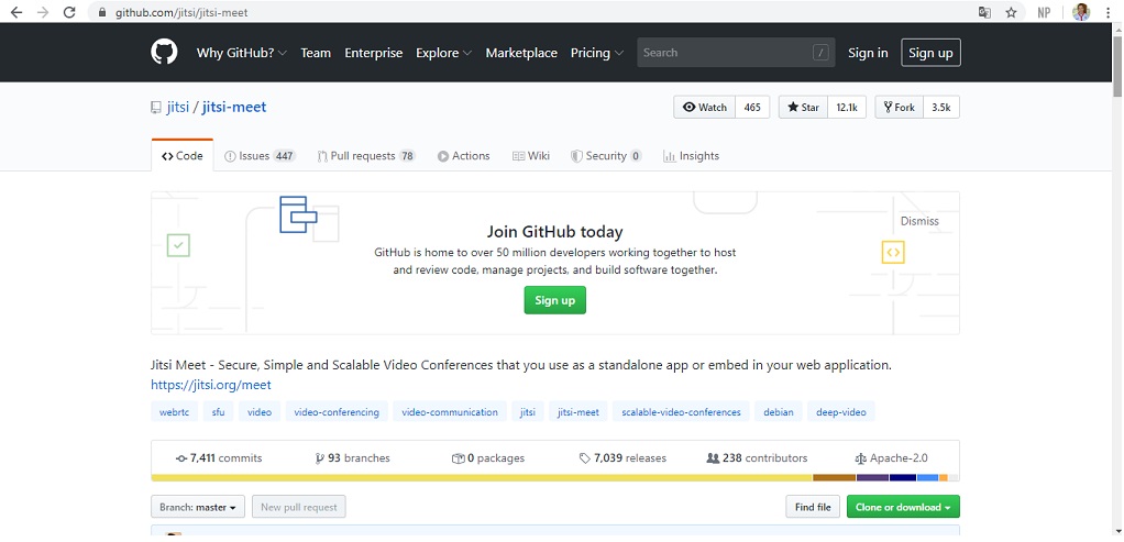 Na página do github mais de 7 mil commits e releases, 93 branches, em uma comunidade de mais de 200 contribuidores – https://github.com/jitsi/jitsi-meet