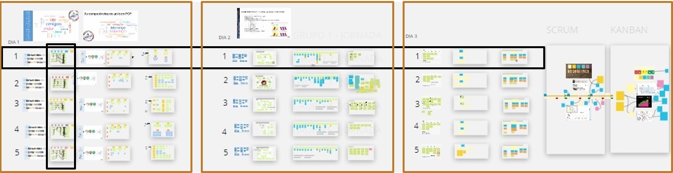 #1. Um treinamento sobre o papel de PO, com exercícios em equipes do início ao fim, seguido de alinhamentos e assim por diante. Duração foi de três turnos, quórum de 25 pessoas ao todo, sempre distribuidos em 5 equipes. Alguns exercícios era a montagem de um canvas, as vezes debate com P&R, brainstorming, a medida que íamos avançando no conteúdo. A cada 7 a 10 páginas de informação, intercalei com práticas e debates. O Miro foi construído previamente, cinco trilhas, montei a primeira com imagens e zoneei, depois copiei para as outras quatro trilhas (linhas), uma para cada equipe. Foram em média cinco exercícios por dia.