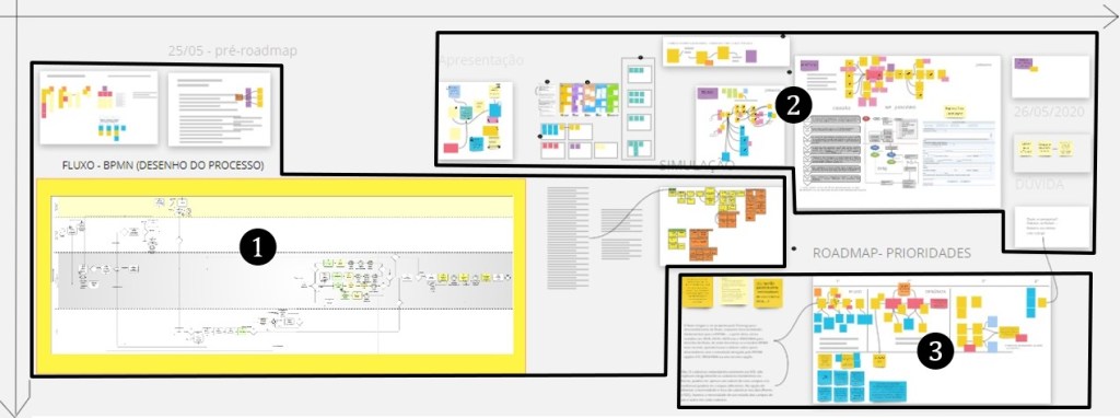 #4. Uma facilitação envolvendo três soluções, uma resultante de mais de 20 anos de desenvolvimento evolutivo, uma mais recente construída para ser uma espécie de mural para o cliente e o desenho de uma nova chamada Fluxo contemplando novas funcionalidades essenciais para otimização do trabalho e geração de orquestração de processo / workflow. O objetivo era debater as três e montar um roadmap de prioridade que contemplaram o desenvolvimento iterativo do Fluxo, integrações e migrações de funcionalidades do sistema mais antigo. Da esquerda para a direita, primeiro o entendimento da situação atual e o BPMN do Fluxo, segundo as abordagens e cenários possíveis, terceiro o planejamento de quatro ondas de desenvolvimento, com muitos postits para enriquecimento de informações sobre a complexidade do tópico ou conjunto.