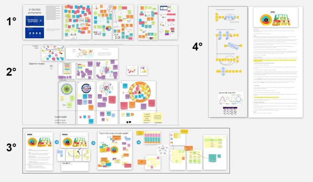 #2. Facilitação para um debate, brainstorming e desenho de um modelo de estrutura e mecanismos para uma área inovação com a responsabilidade de orquestrar investimentos em startups, focado no empreendedorismo em produtos digitais. Foram quatro reuniões, um turno a cada semana, iniciamos por um alinhamento e debate sobre fundamentos e modelos em escala, trabalho em grupos, ideias, P&R. O número dois foi a co-criação em 4 equipes de modelos diagramáticos propondo estrutura e mecanismos. O terceiro foi a consolidação em uma só visão diagramática e o debate mais detalhado dos principais mecanismos. Por fim, o passo quatro foi o refinamento do modelo através dos seus quatro principais mecanismos – eventos, papéis, frequência, objetivos, … quase um 5w2h.