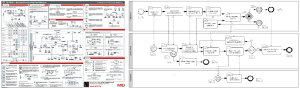 “Business Process Model and Notation” é uma notação para gerenciamento de processos de negócio, prevendo uma centena de ícones padrão, regras e pré-definições no desenho de processos organizacionais, visando treinamento, padronização e auditoria. Muito útil para registro formal de processos, o que exige profissionais treinados. Exemplo teórico: