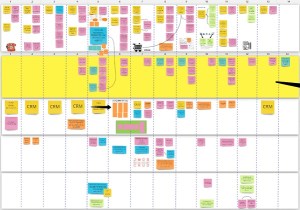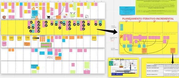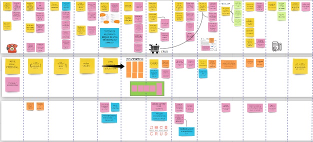 1. O resultado sempre são muitos postits, cores, tamanhos, certo improviso e a certeza de que adaptamos o que for para que todos os presentes saiam com um entendimento comum, único, materializando o máximo de informação úteis e pontos de atenção. No exemplo tenho linhas bem largas com informações para entendimento, frontstage, backstage e métricas … no início não tinha métricas e incluí, mas tinha atores envolvidos e suporte, que eliminei.