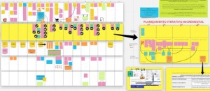 2. O importante é aproveitar ao máximo o mapa de jornada e blueprint, customize-o conforme necessidade, então crie uma thread para os itens planejáveis nos MVP, MMP, Releases, … Eu crio uma linha em destaque no blueprint (no caso está em amarelo). A técnica é rever cada coluna em suas informações e pontos de atenção e ir criando os postits que representam features ou atividades que serão incluídas no planejamento de seus entregáveis (MVP, MMP, Releases), quer em ondas, sprints, iterações ou um plano de ação.