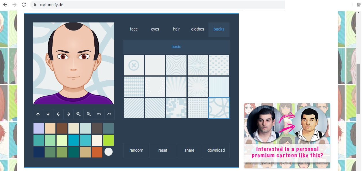 Outro freemium bem legal é o https://www.cartoonify.de/ que libera uma criação bem legal no free, mas o premium decididamente são obras de arte. Dá para customizar vários aspectos do rosto, cores, detalhes, …