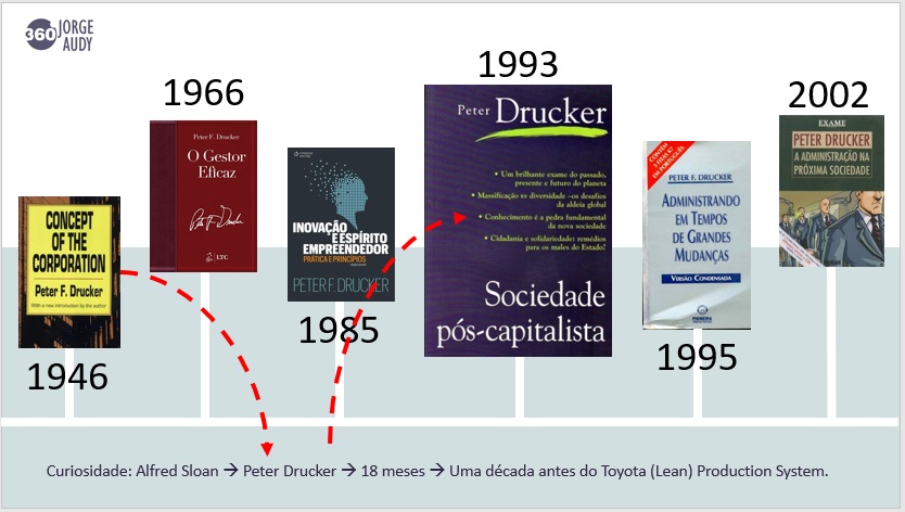 Outro fato que poucos conhecem é que PETER DRUKER foi convidado a estudar e avaliar a GM, seu relatório foi parcialmente desconsiderado por Sloan. Druker já havia percebido a relevância do foco nas pessoas uma década antes de Ohno e Toyoda baterem as portas da história com o Toyota (Lean) Production System, incentivando equipes auto-organizadas, foco de toda a organização no por que e não no como e aprendizado organizacional baseado em Kaizen.