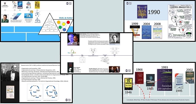 Fiz cinco mapas visuais da produção de alguns dos nomes que mais cito em relação à organizações que aprendem e empreendem (inovam), iniciando por Nonaka e seus parceiros, depois Peter Senge, Peter Druker, Chris Argyris e John Kotter. Individualmente já compartilhei várias vezes os pensamentos e modelos de cada um deles.