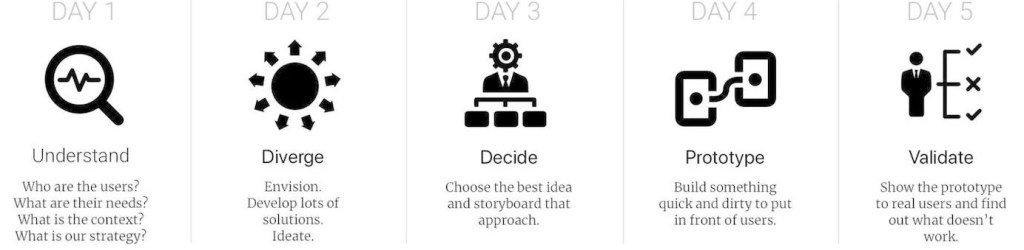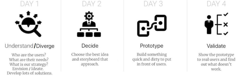 Proposto inicialmente para 5 dias, enfatizando interação máxima entre equipe e envolvidos, stakeholders e especialistas. Na versão 2, são 4 dias, destacando a ênfase a ter-se o grupo completo nos primeiros 2 dias, aparentemente cedendo a restrição dos stakeholders e especialistas de domínio. Por isso, concentraram nos dois primeiro dias o entendimento, decisão e storyboards.