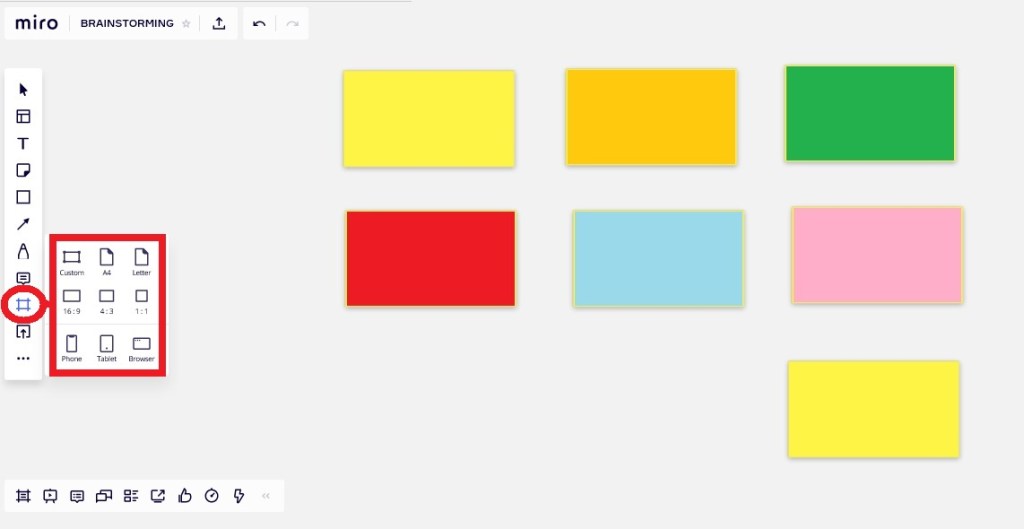 Quando pedimos um novo frame, o Miro oferece alguns formatos padronizados e eles tem a ver com diferentes tamanhos mais comuns para edição, simulações e … apresentações. Por exemplo, 16:9 ou 4:3, sobre os quais realizaremos nossa facilitação, depois sobre ela mesma realizar uma apresentação.