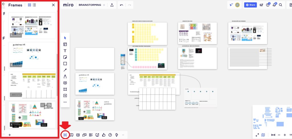 Ao usar frames, funcionalmente ou apenas com o objetivo de demarcar seus ‘slides’, o seu board assume aspectos que facilitam uma apresentação sem a necessidade de gerar outro arquivo para tanto, mantendo a centralização das informações, evitando redundância e versões desnecessária (*).