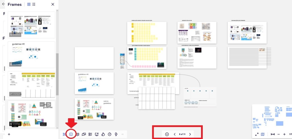 O segundo ícone do menu inferior a esquerda é o de apresentação, logo, ao clicar nele o MIRO apresenta ou oculta uma opção de ‘paginação’ no pé-de-página do board ao centro, as setas para a esquerda e direita faz as trocas dos frames, centralizando-os na tela.
