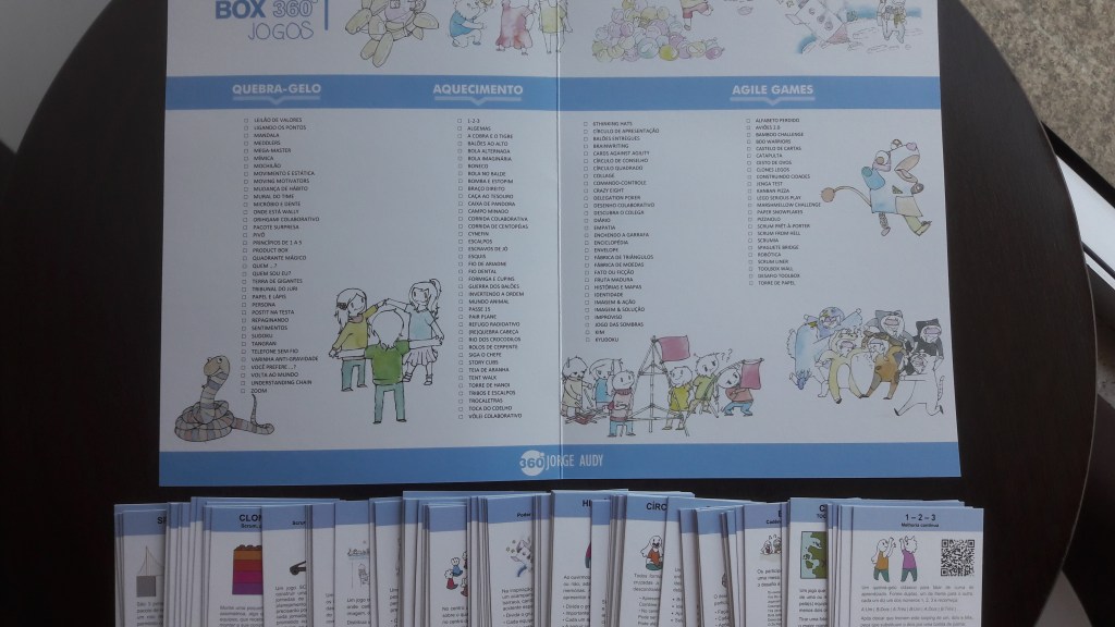 Em 2015 eu lancei os livros TOOLBOX 360° e JOGOS 360°, cada um deles contando com mais de 70 técnicas e jogos. Em 2016 converti ambos para tabuleiro e baralho, que foram se desenvolvendo e incluindo novas cartas a cada edição, que atualizo a cada ano.