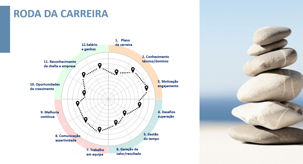 Assim como usamos a Roda da Vida para desenhar uma avaliação macro de aspectos pessoais, profissionais, relacionamento e de qualidade de vida, também temos a Roda da Carreira, onde fazemos um breve assessment sobre aspectos de carreira, trabalho e mercado.