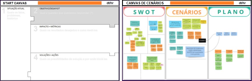 A tempo, os dois canvas citados no primeiro parágrafo deste post são estes abaixo, criados para serem versáteis, adaptativos a cada contexto. Eu uso técnicas variadas complementares ao redor sempre que necessário, como estrutura e portfólios antes, priorização e Odyssey depois, com bons resultados: