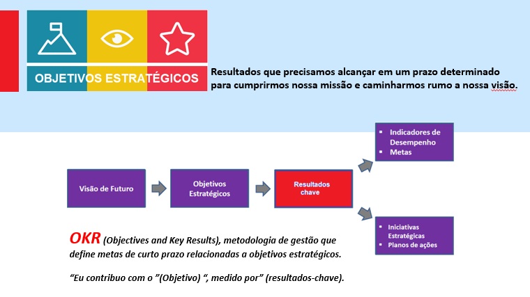 - Materializar a estratégia a vista e disposição de todos, devidamente desdobrados, se for o caso, em unidades de negócios ou áreas de atuação. Isto nos autoriza a criar key-results demonstrando de que forma nossos produtos, serviços, projetos e operações estarão contribuindo com o todo.
