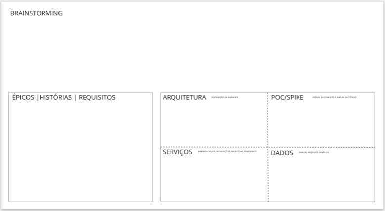 Fizemos um exercício de entendimento, debate e materialização em um canvas que criei para isso, com quadrantes organizados para: Área livre para brainstorming, épicos, arquitetura, poc’s, serviços e dados. Inexistia ordem ou necessidade de preencher todos, mas registrar entendimento, opinião e dúvidas.