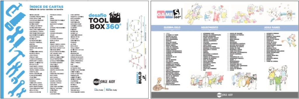 A compra do kit de tabuleiro e baralho do Desafio Toolbox 360° ou Jogos 360° pode proporcionar diferentes experiências, usados como base de consulta, fichário de ítens, são 130 cartas em cada kit. Um acervo também disponível digitalmente aqui no blog, mas que tem nos baralhos uma opção versátil para manuseio.