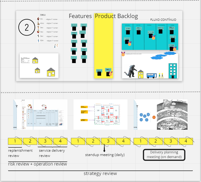 No modelo em escala eu tenho um com sprints seguindo o Less ou um de fluxo contínuo seguindo o Kanban e simulando os dois primeiros níveis do Flight Level … times e coordenação. Após o primeiro entregável é possível aprimorar nosso sistema Kanban, incluindo alguns detalhes ou não.