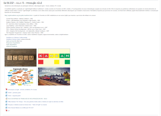 Exemplo 2 – encontros Moodle) Cada encontro, inicia um tópico com data e título/objetivo, seguidos por uma breve descrição e imagens do tópico proposto e depois construído no MIRO, para então colocar o PDF, o vídeo e uma lista de links adicionais com o que de melhor há em conteúdos sobre o tema em questão.
