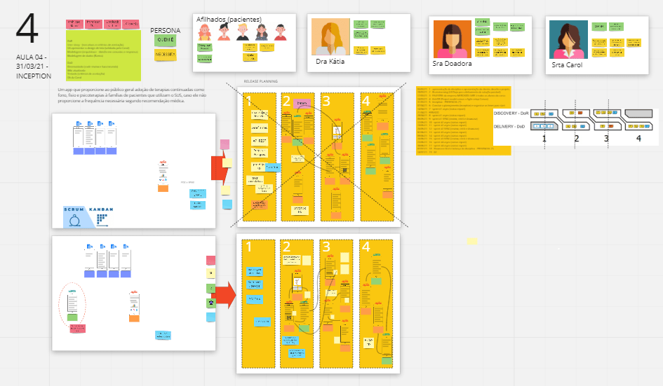 AULA 4 – Na quarta aula o foco foi resgatar e detalhar as personas, empatia pelas suas necessidades e objetivos, dividir a turma em dois grupos multidisciplinares em salas onde aconteceram uma inception, debateram as jornadas, as funcionalidades, as priorizaram e dividiram em três entregáveis, cada qual com o foco em uma meta específica de valor – doação, segurança e cruds. Foi um trabalho sensacional, cada grupo debatendo e construindo a sua proposta de planejamento, entendimento de valor e viabilidade: