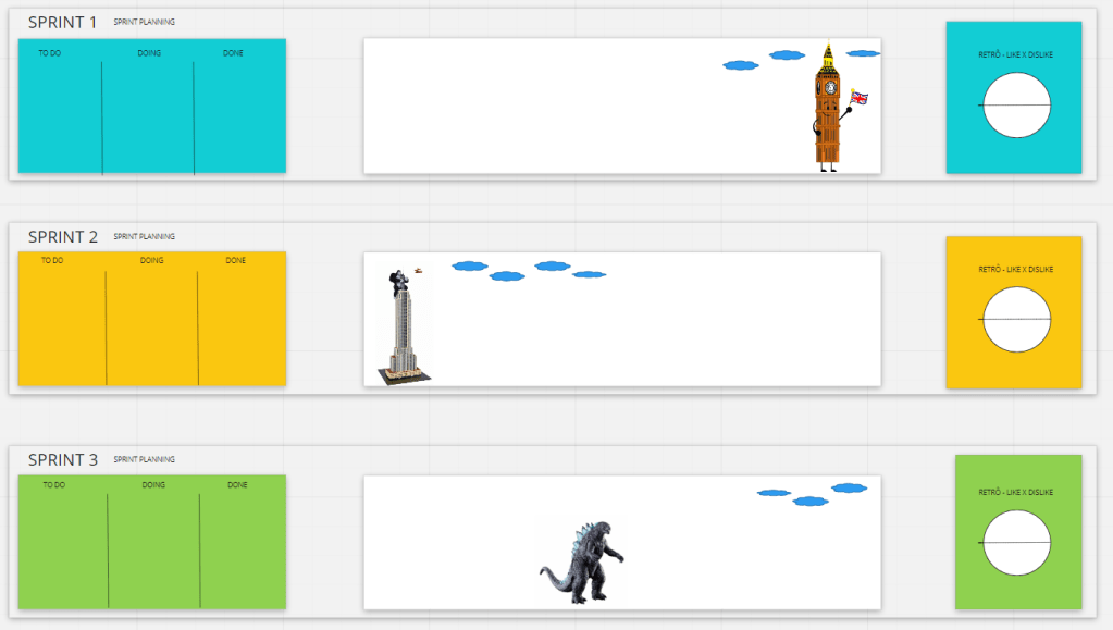 Em todas as equipes temos o mesmo pack para execução de até três sprints, tem em cada uma um board com as histórias que serão trabalhadas na iteração, um quadro branco que representa o patio de obras, onde as construções de casas, prédios, carros e caminhões acontecem conforme a especificação. A direita, com destaque, uma retrospectiva simples com duas áreas – like e dislike – para debaterem melhoria contínua.