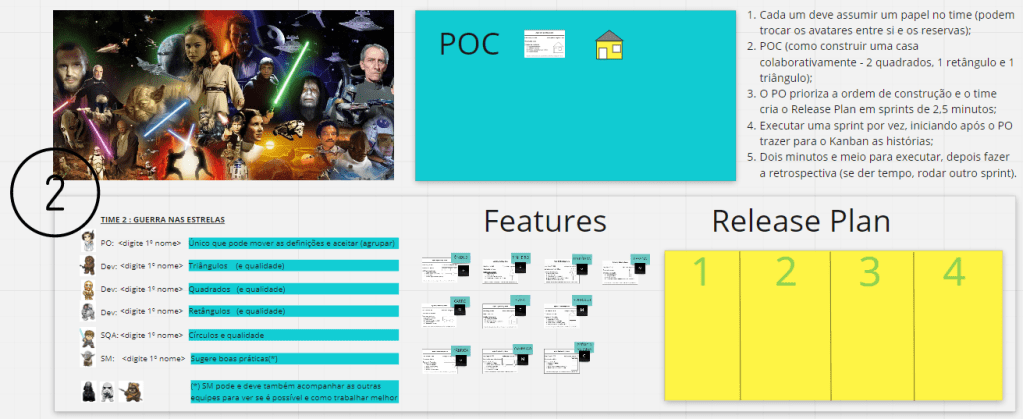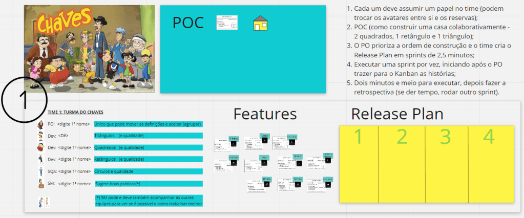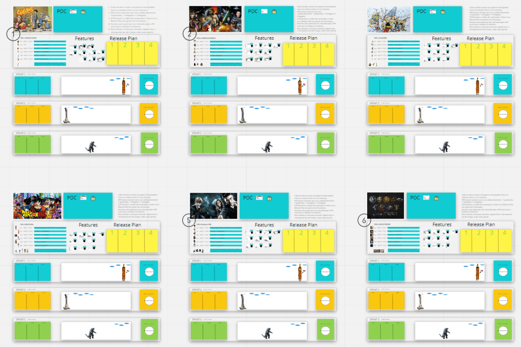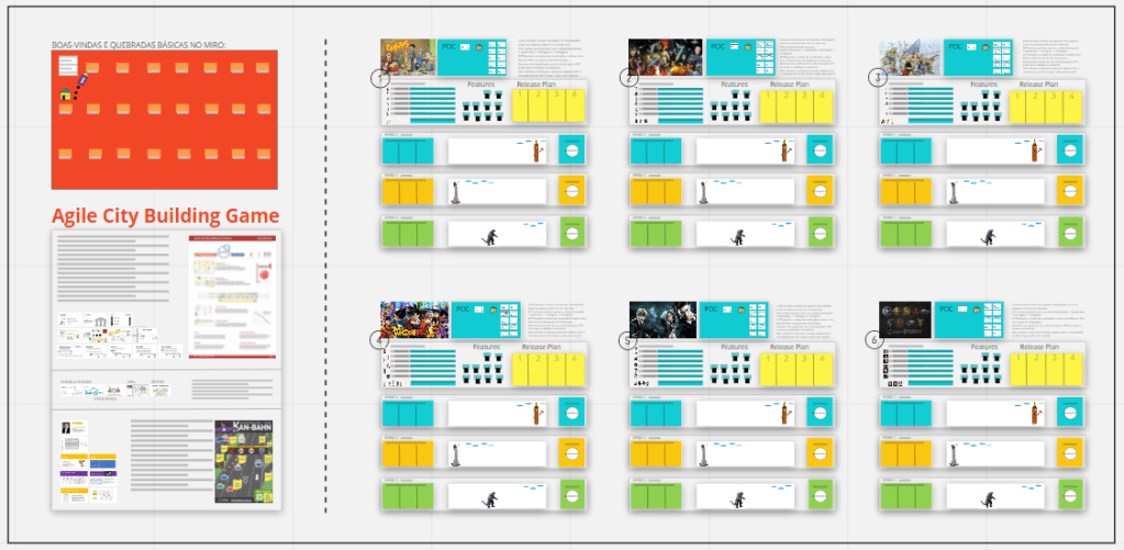 A esquerda temos, encima o quebra-gelo para navegação, operação e funcionalidades básicas no Miro, embaixo o material para uma lightning talk falando de Scrum, Kanban ou escala (três versões mais usadas). A direita temos até seis equipes, cada qual com um bloco equivalente de instruções e formatação para rodar o jogo de forma independente. Em todas temos alguns papéis, backlog e quadro durante a execução.
