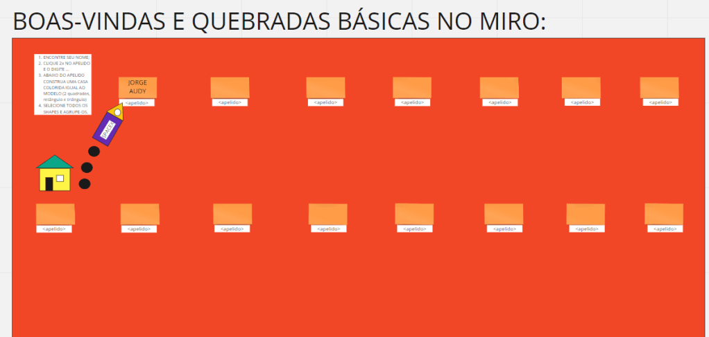 Na sequência, peço que exercitem isso encontrando e se posicionando em um postit já com o seu nome, para logo abaixo clicar duas vezes em um texto para o “apelido” de cada um. Depois, exercícios de inclusão de shapes e postits, trocando cores, redimensionando-os, posicionando-os … Quadrados, retângulo e triângulo para construírem uma casinha igual a minha, inclusive nas cores e dimensões.