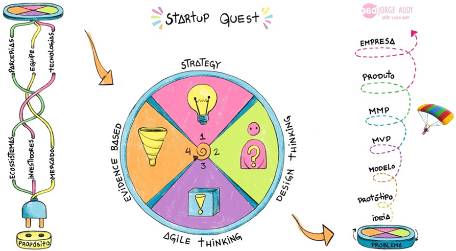 Talvez minha contribuição com o modelo “Startup Quest“ possa ajudar de alguma forma. É para ser um modelo didático, por isso está organizado da seguinte forma: A esquerda temos 6 (seis) forças motrizes, ao centro um ciclo de 4 (quatro) disciplinas, a direita uma espiral com 7 (sete) etapas evolutivas, passível de inícios, validações, reinícios, pivots e crescimento,