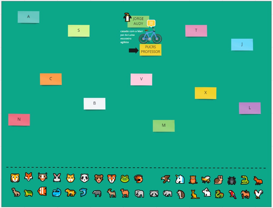 Na preparação, já deixo um postit com o nome de cada participante previamente, caso contrário terá um passo inicial em que cada um escolhe um postit e escreve seu nome. Eu já deixo os emojis disponíveis logo abaixo ou ao lado do quadro do jogo, bichinhos é o que eu mais uso, mas tem frutas, carinhas, esportes e objetos.