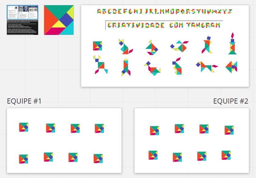 A escolha pelo Tangram é diversão, tornando-o um acelerador prévio a uma sessão de ideação. É para ser um quebra-gelo divertido, descontraído, criativo, explorando novas sinapses, pensar além do óbvio, … É importante enfatizar que queremos o maior número de figuras criativas possível.