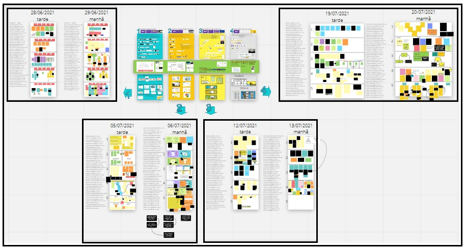 A seguir alguns exemplos de dinâmicas, duas oficinas de design, uma inception e um treinamento, cada qual com fracionamento e intercalação entre momentos síncronos e assíncronos. Cada turno ou dia síncrono possuiu de um turno, dia ou uma semana assíncrona para tarefas próprias.