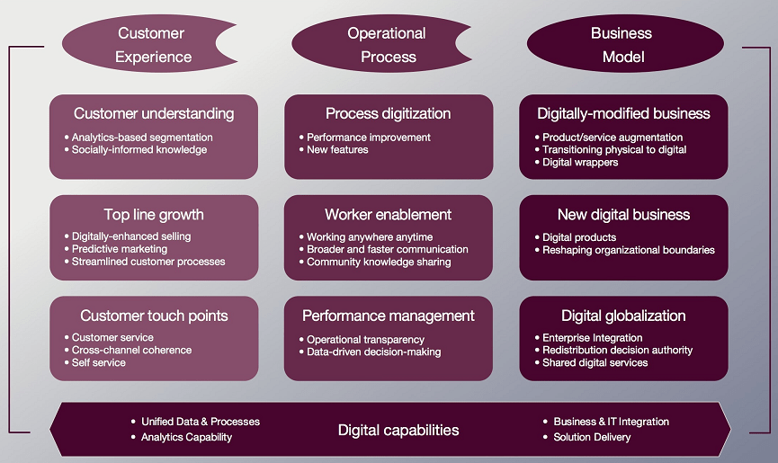 No artigo sobre Transformação digital da Capgemini, eles dividem em três verticais – Experiência do cliente, Processos operacionais e Modelo de negócio. Cada uma delas, explicitando diferentes competências ou abordagens úteis e valorizadas em cada uma delas.