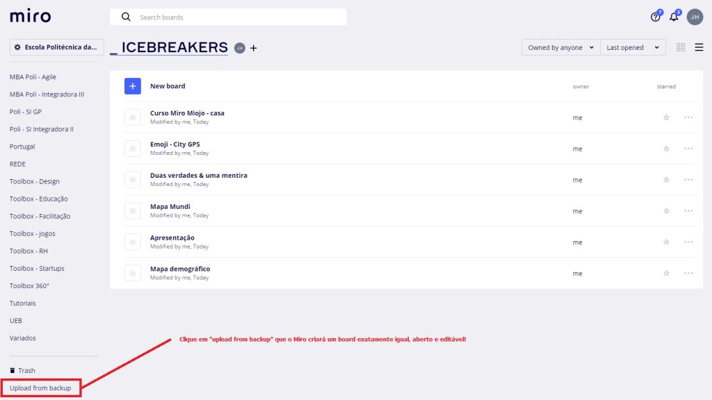 Para fazer upload do arquivo é só baixar e depois clicar na última opção da lista de projetos do seu Miro … Boa sorte – https://drive.google.com/file/d/1VBdaob7aRnwRB4JBejMKcDbqJq8EB9KL/view?usp=sharing