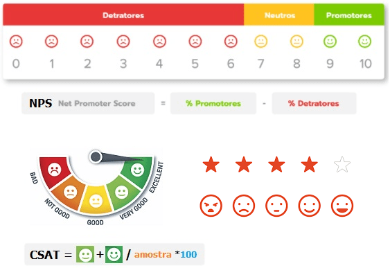 - CSAT é a pontuação de satisfação do cliente e indica o quão satisfeito um cliente está em relação a um atendimento ou uso. Considerado uma métrica de curto prazo;