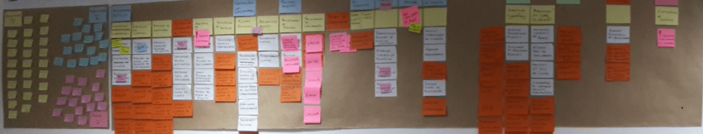 Estabeleçam significado às cores dos postits, pode usar também folhas A4 impressas, há casos que colo as principais telas do sistema, quando no Miro é possível enriquecer colando hiperlinks acionáveis. O resultado é sempre impressionante, o efeito no grupo mais ainda enquanto oportunidade de resgate e comemoração!