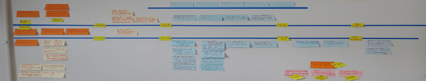 Parece muita coisa, mas não é, só uma linha horizontal em uma parede ou Miro, a esquerda um mapa sociográfico com os envolvidos, um moodboard, … A direita disso, a linha com uma marcação de semanas ou quinzenas, de forma a acomodar postits ou imagens contendo informações temporais.