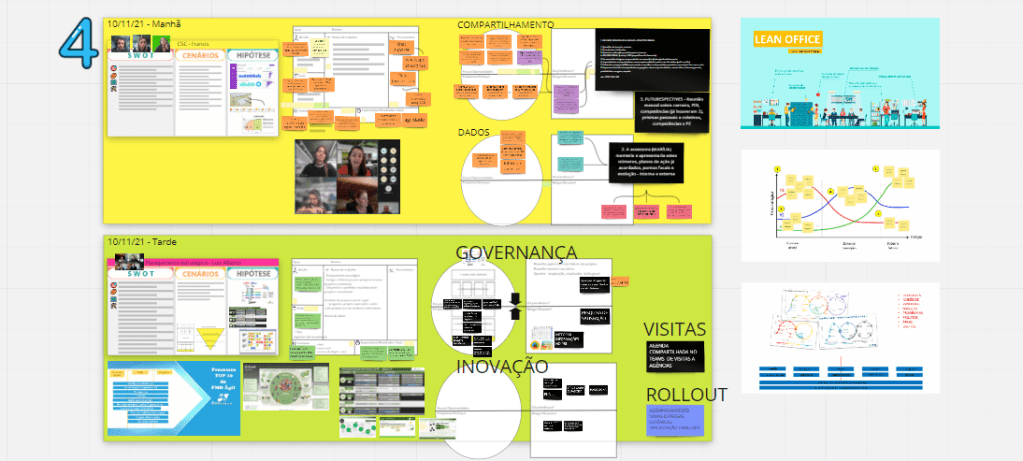Na outra equipe, que já tinha uma abordagem Lean e Agile bem alinhada, foi possível discutir várias questões relacionadas a governança e dashboards, opções de MVP para instigar inovação e a gestão de uma agenda compartilhada sobre saídas a campo/visitação. Discutimos nestes casos pontos de atenção, alternativas de implementação, mas cada um deles dependerá de desenvolvimento de um experimento mínimo inicial nos próximos dias.