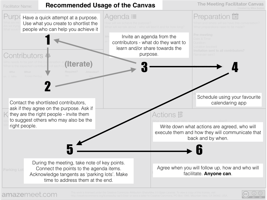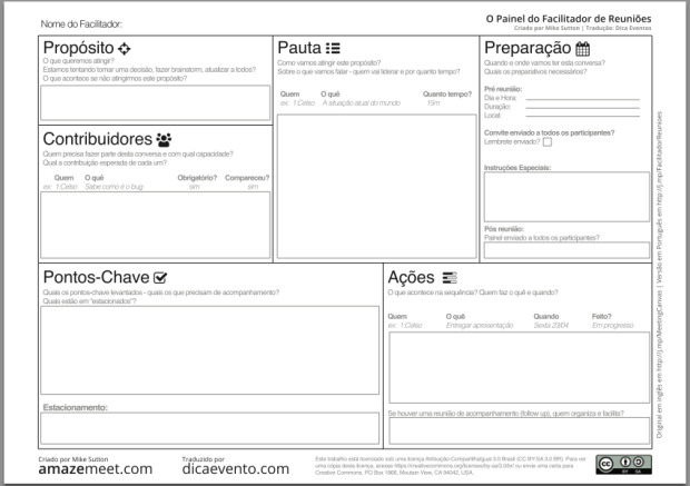 Uma versão mais simples está representada abaixo – Painel do Facilitador de Reuniões (Meeting Facilitator Canvas). Segundo Mike Sutton no Amazemeet é muito comum ver gestores que odeiam a falta de propósito, a falta de estrutura, a má ou inexistente moderação nas reuniões.