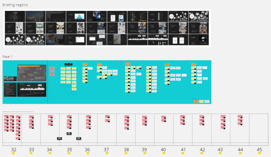 Neste caso, selecionamos o material base para o briefing e discutimos brevemente o backlog conhecido entorno de alguns épicos e features, material que foi importado e transcrito para o Miro. No quadro, no topo o espaço dedicado ao briefing, no meio os épicos e features conhecidas e na base uma matriz para planejamento de entregas (iterações).