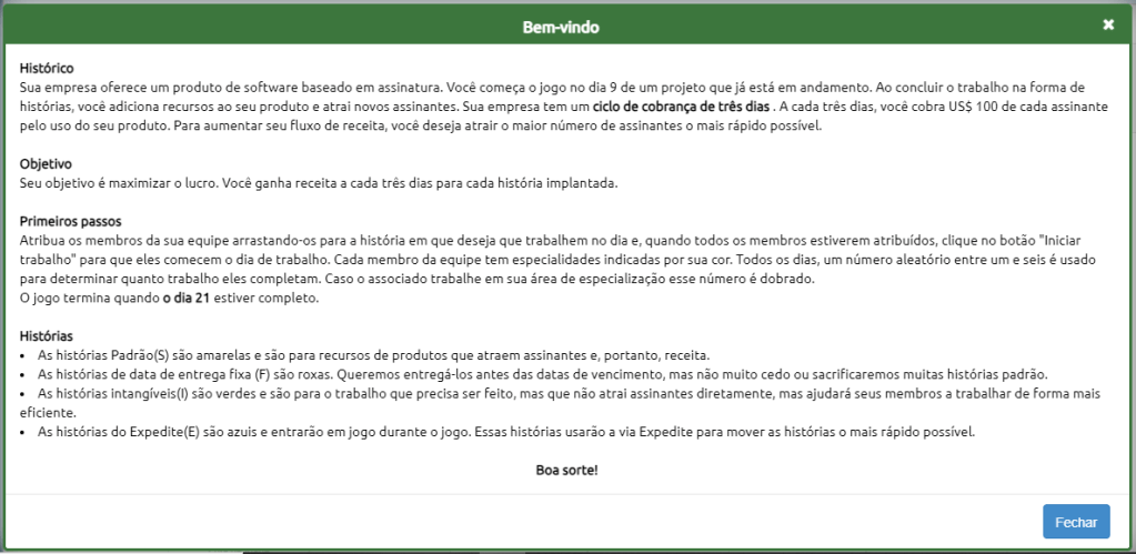 Conforme escolha inicial, o jogo demanda 35 ou 21 dias e vai remunerando suas entregas a cada 3 dias, gerando o total utilizado para resultado e ranking. Lembrando que há um fator aleatório do quanto cada profissional gera de trabalho a cada dia.