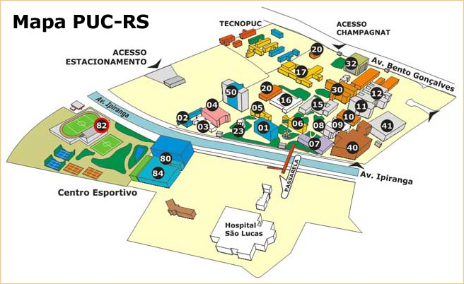 Quem vem a pé, pode acessar pelo portão principal ou direto pelo portão 6 na Av. Bento Gonçalves 4592, que está aberto de segunda à sexta-feira, das 7h30 às 19h. No mapa, o portão principal fica na Av Ipiranga, 6681 logo após a passarela e o TecnoPUC na esquerda superior.