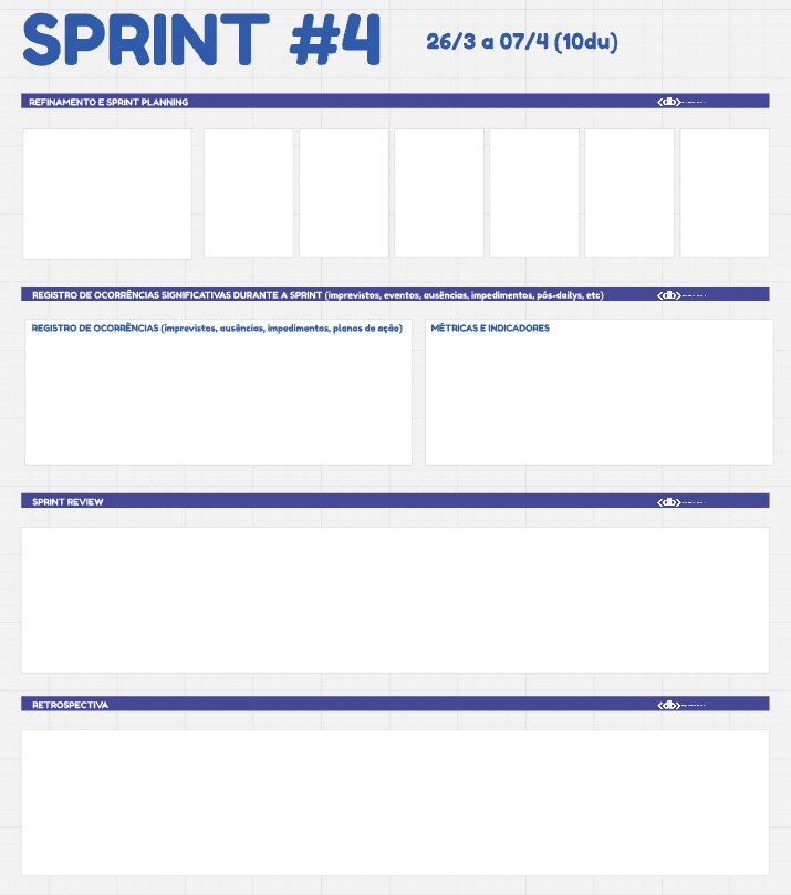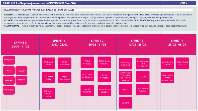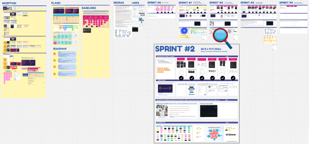 Tem diferentes formas de estruturar as Srints ou iterações, mas manter um registro mínimo de cada um dos passos (planejamento-diário de bordo-review-retrô) é muito importante e retroalimenta possíveis novas Baselines. A cada nova Baseline é importante manter o frame de justificativa, contextualização ou negociação.