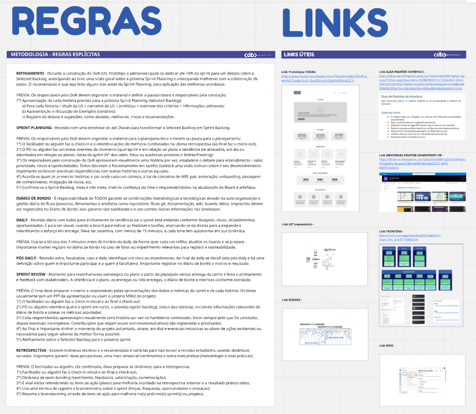 - Links – Todos os links de artefatos e ferramentas (repos, wiki, boards, guias, etc);