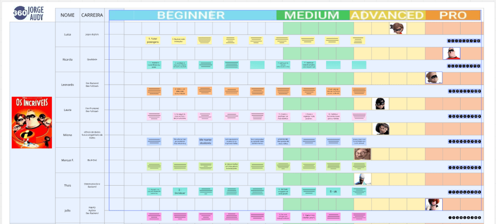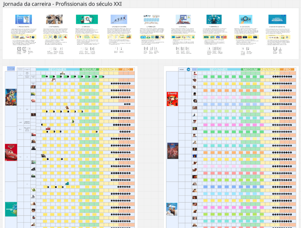 Na criação do board, modelei de forma que para cada filme da PIXAR eu tenha entorno de 6 ou 7 linhas com personagens. Isto torna o visual mais colorido e divertido, pois cada participante pode escolher o seu personagem a gosto. No template eu tenho 60 personagens, permitindo uso em sala de aula e em eventos.