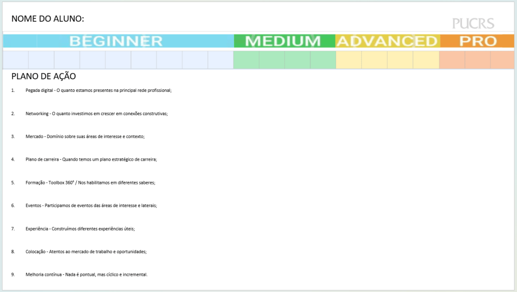 Se forem alunos ou evento presencial, eu imprimo uma folha para cada um onde tenho no topo um espaço para o seu nome, abaixo tenho na horizontal de ponta a ponta a escala de 20 passos (begginer, medium, advancep, pro) e todo o restante coloco 9 ícones ou lista numerada em branco para que possam digitar as iniciativas ou ações.