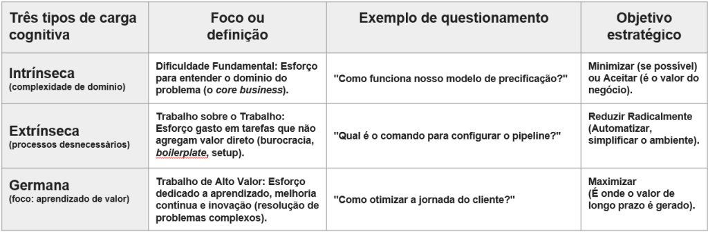 Conceito desenvolvido por Matthew Skelton e Manuel Pais, publicado originalmente no livro Organizing Business and Technology Teams for Fast Flow de 2019 – “O verdadeiro gargalo, o real limitador à nossa capacidade de entrega de software, não é a tecnologia, mas um fator humano, a Carga Cognitiva da Equipe.”