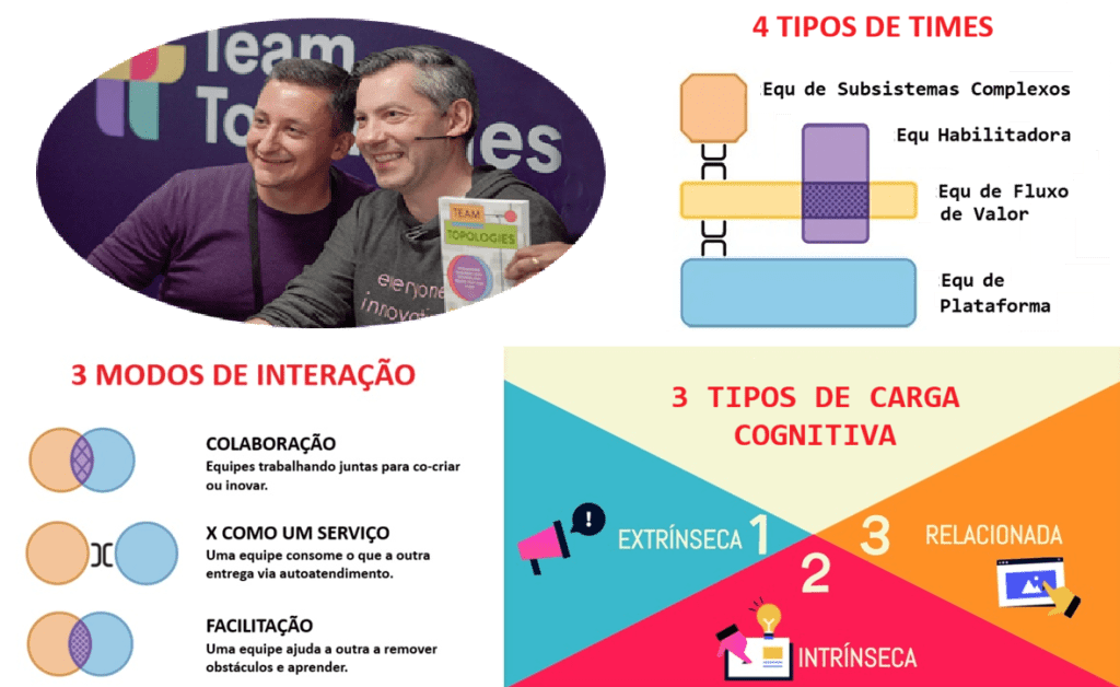 Os 3 conceitos-chaves são: Há 3 tipos de carga cognitiva a serem consideradas, 3 modos de interação a serem desenvolvidos em combinação e 4 tipos de times, um com domínio do fluxo de valor, um habilitador (especialialidades transversais), um de plataforma (infraestrutura) e um de subsistemas complexos.