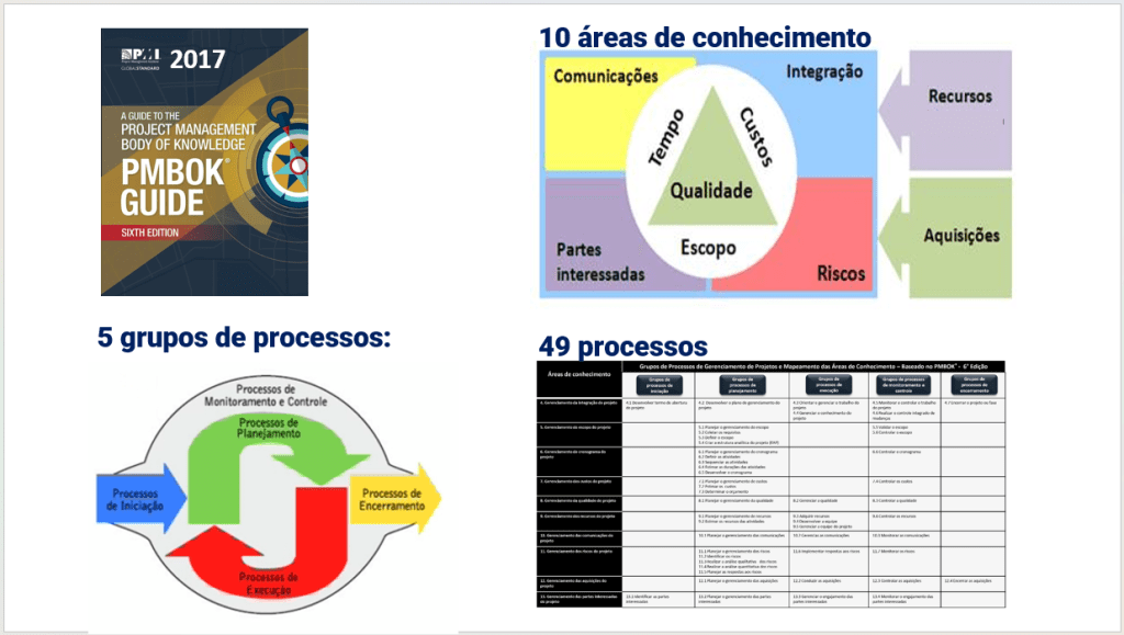 O principal guia do PMI, o PMBOK, começou a ser publicado em 1996. Desde o início, desenvolveu um racional baseado em 9 ou 10 áreas, com 37 a 49 processos, crescendo de 172 para 756 páginas na sexta edição. Entretanto, a sétima edição de 2021 mudaria tudo, erradicando áreas e processos, reduzindo para 274 páginas.