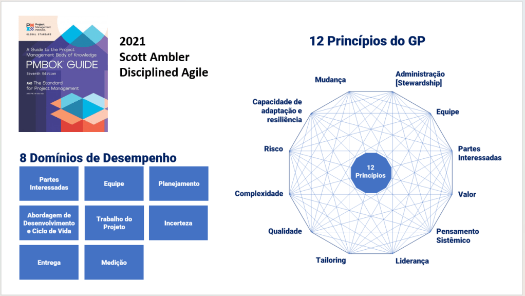 PMBOK 7ª Ed – Esta edição representa uma grande guinada do PMBOK, substituindo uma proposta preditiva baseada em áreas de conhecimento e seus processos para uma abordagem mais ágil, baseada em princípios e domínios de conhecimento. O bordão usado pelo Ambler era “ter opções é bom!”, pois há várias formas de gerenciar projetos.