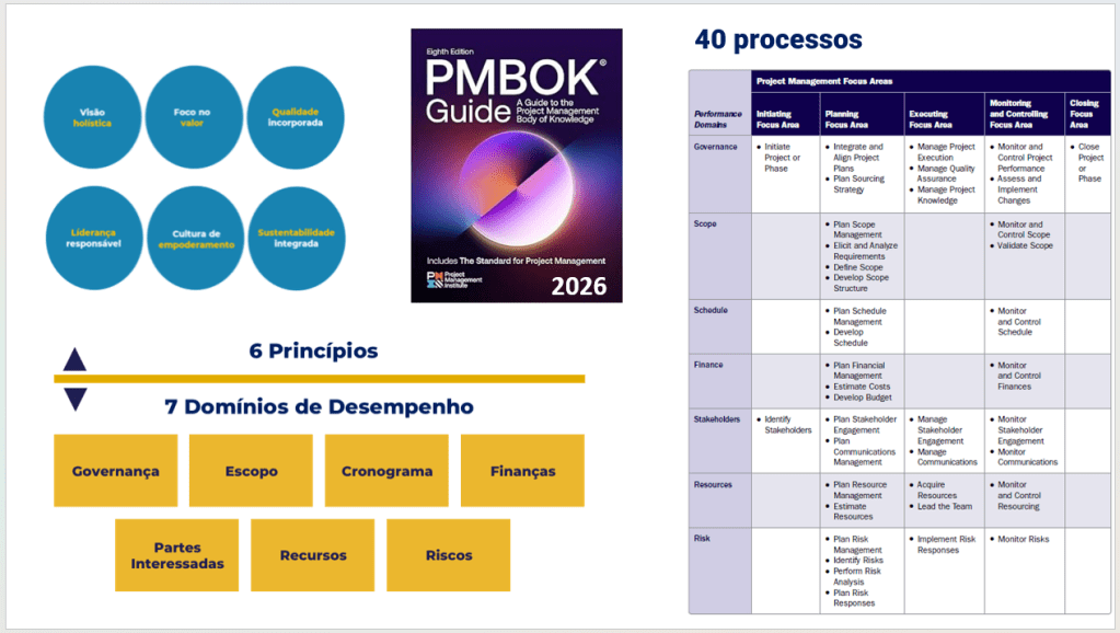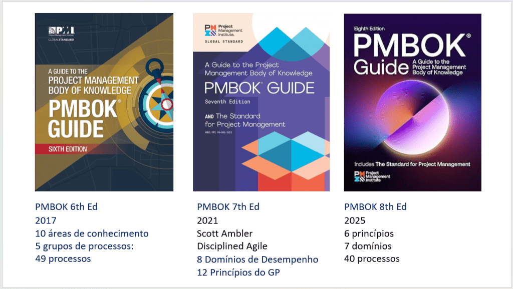 PMBOK 8ª Ed – Esta edição se propõe a compatibilizar o melhor da história do PMBOK e das metodlogias ágeis. Ele combina a estrutura da 6ª edição com os princípios fundamentais introduzidos na 7ª edição. Esta edição foca na entrega de valor mixando processos tradicionais e metodologias ágeis. É o tailoring (adaptação) na prática!