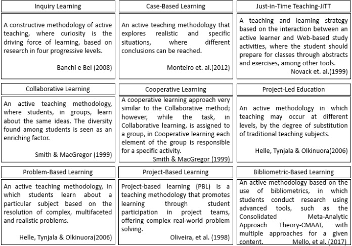 8. Learning 1, 2 e 3.0 – Expositivo-dialogada; Seminário; Trabalho em grupo; Debate entre especialistas; Planejamento colaborativo; Proposta; Brainstorming